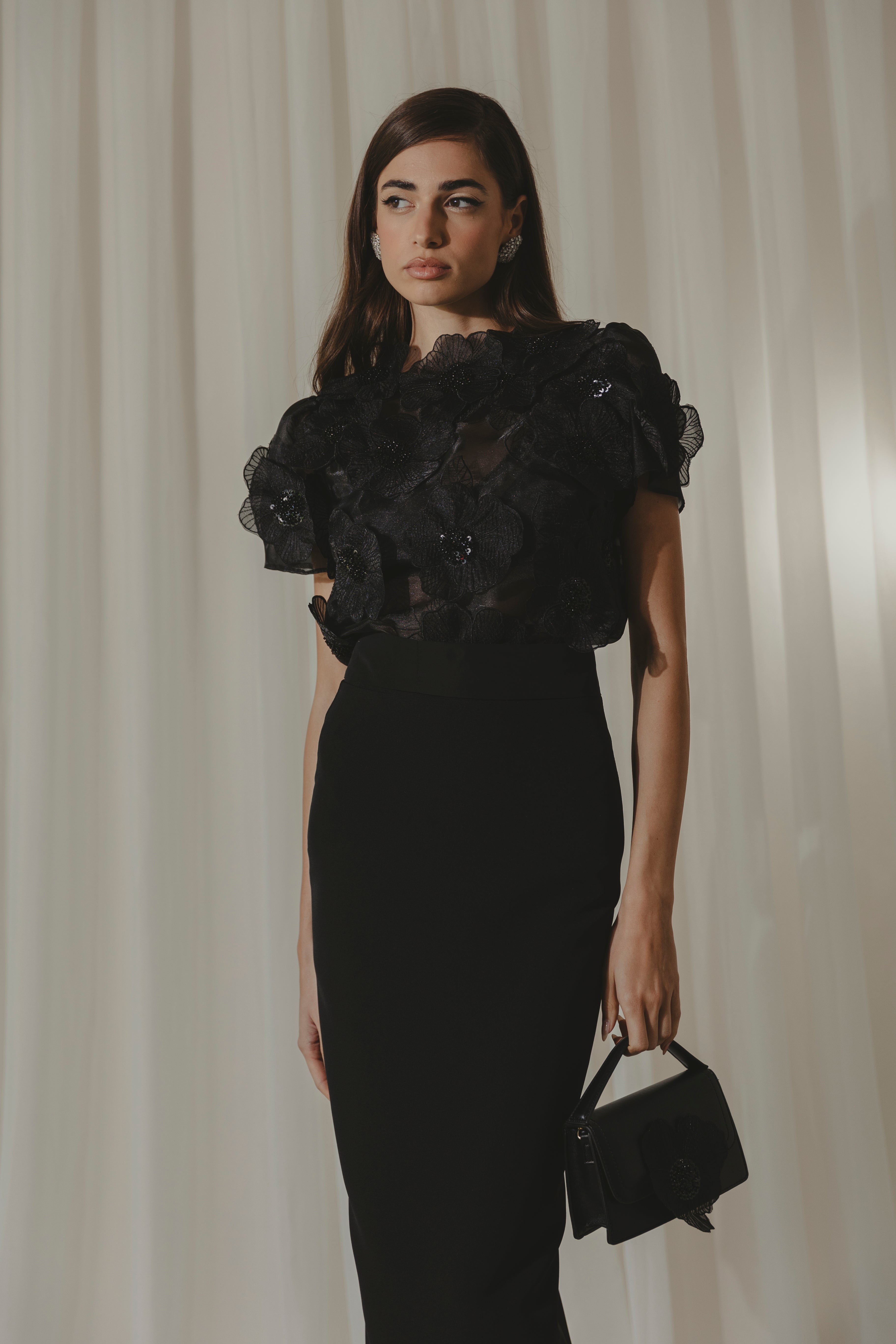 Lola Organza Top with Hand-Applied 3D Flowers-Black