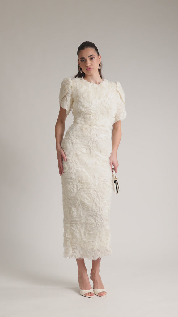 A refined two-piece set crafted from delicate tulle adorned with soft 3D floral appliqués, designed to create a romantic and sculpted silhouette.
