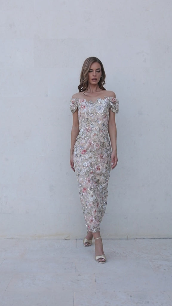 Midi dress (92 cm) with colorful floral embroidery on a nude base, creating a delicate and feminine effect.