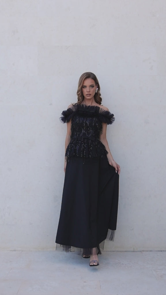 A refined ensemble, perfect for special events or stage appearances, combining femininity with a touch of modern theatrical flair.