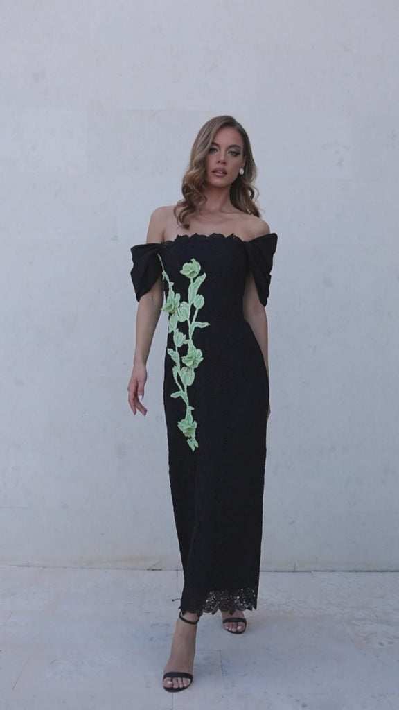 Midi dress (90 cm) made of macramé-style cotton lace in an intense black shade.